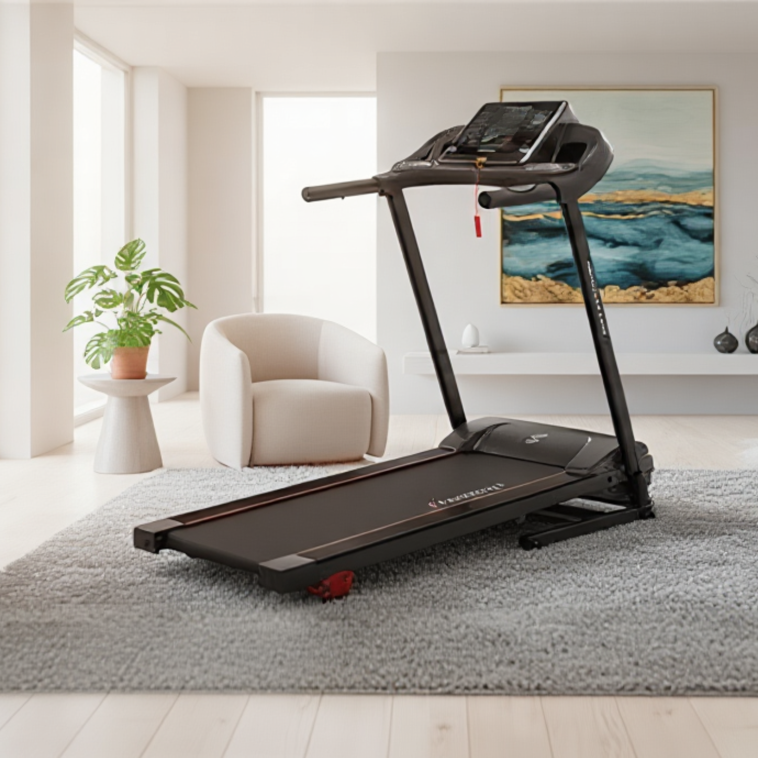 Ein klappbares und neigbares Laufband steht für Freiheit, Leistung und Regelmäßigkeit.