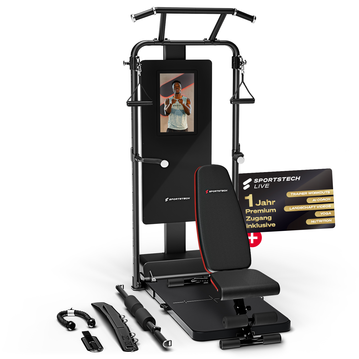Die Sportstech Live App ist bereits vollumfänglich im Display des sGymPro installiert. Beim Kauf der smarten Kraftstation erhalten Sie zusätzlich 1 Jahr freien Zugang zur Premium Version der Sportstech Live App.