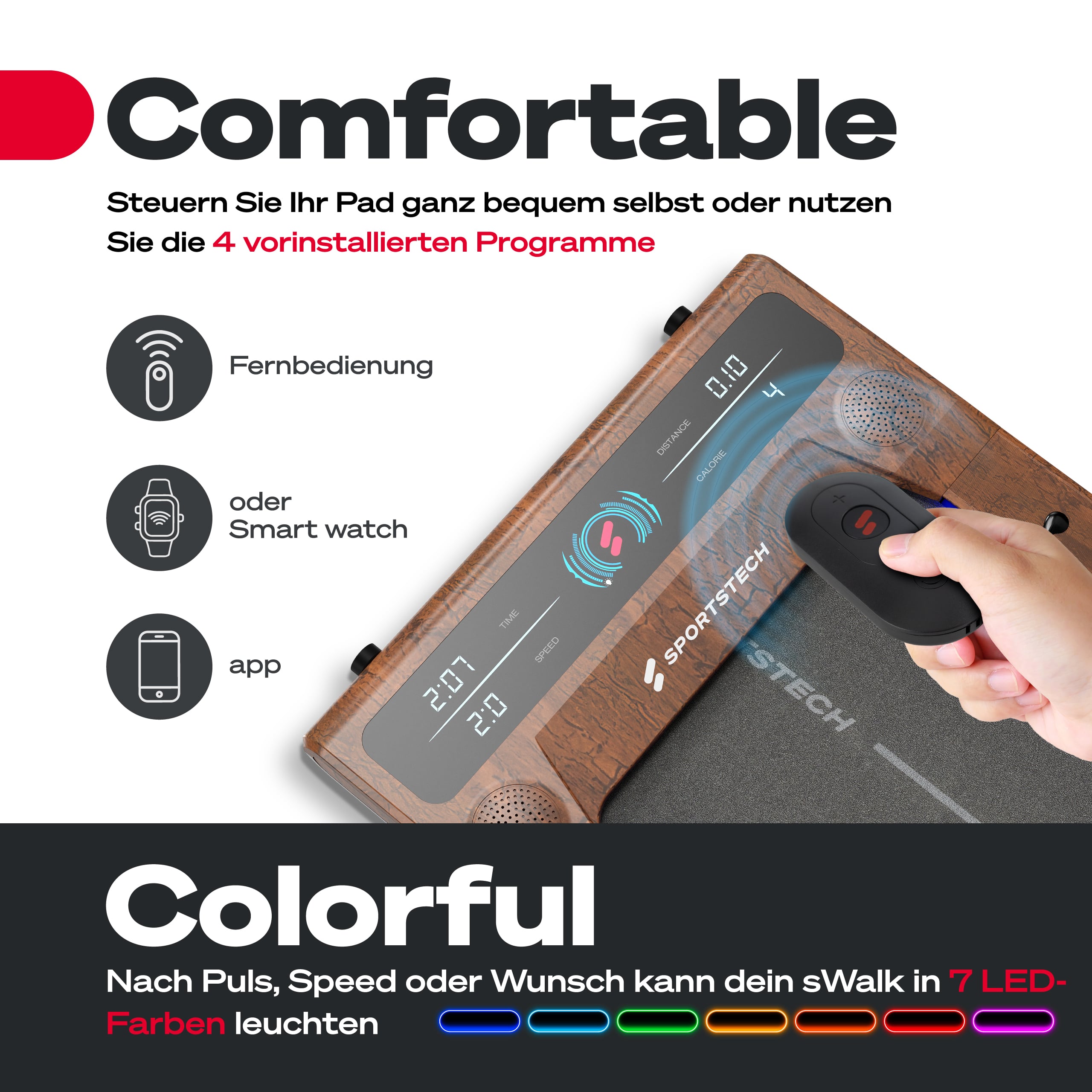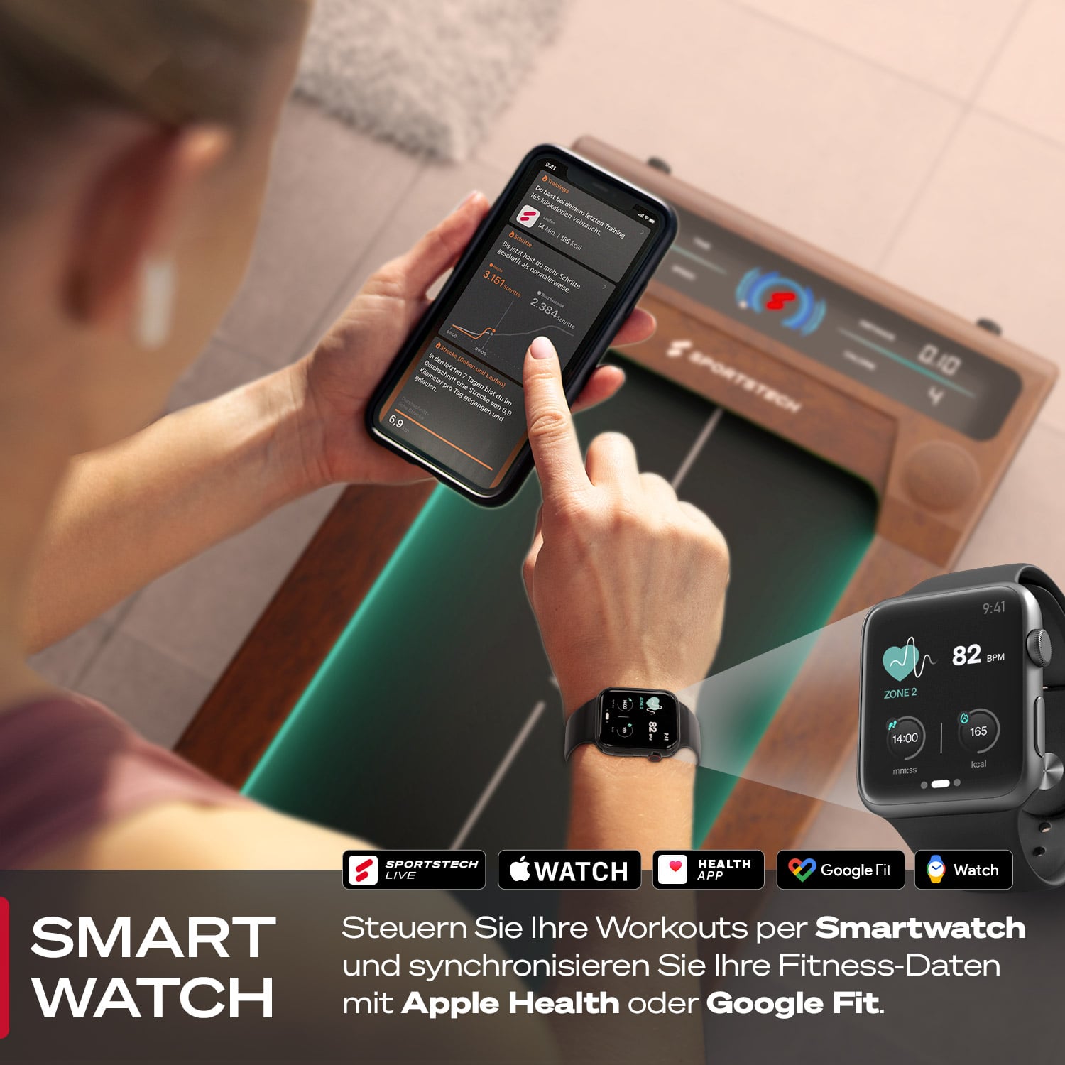 Das Laufband ist kompatibel mit dem "sPulse" von Sportstech. Pairing erfolgt über die App "Sportstech Live