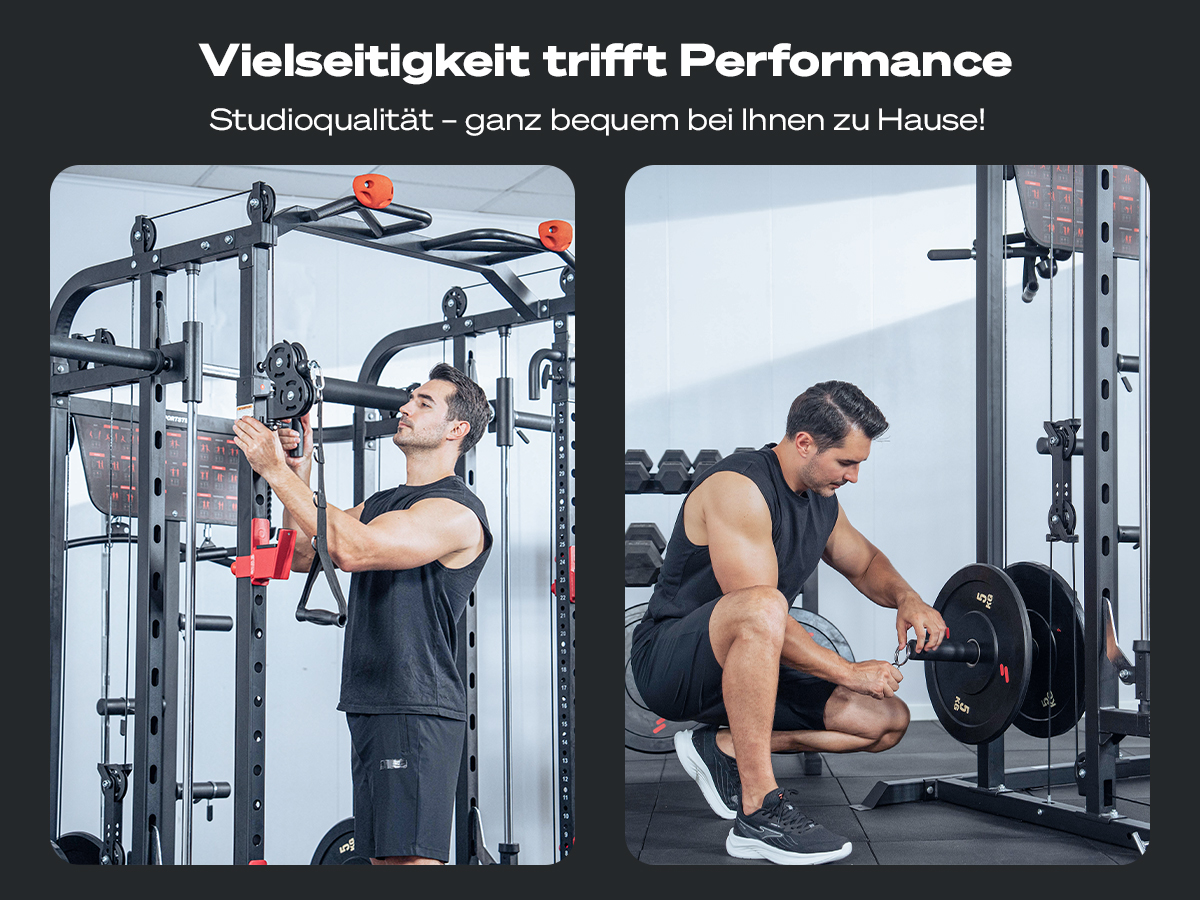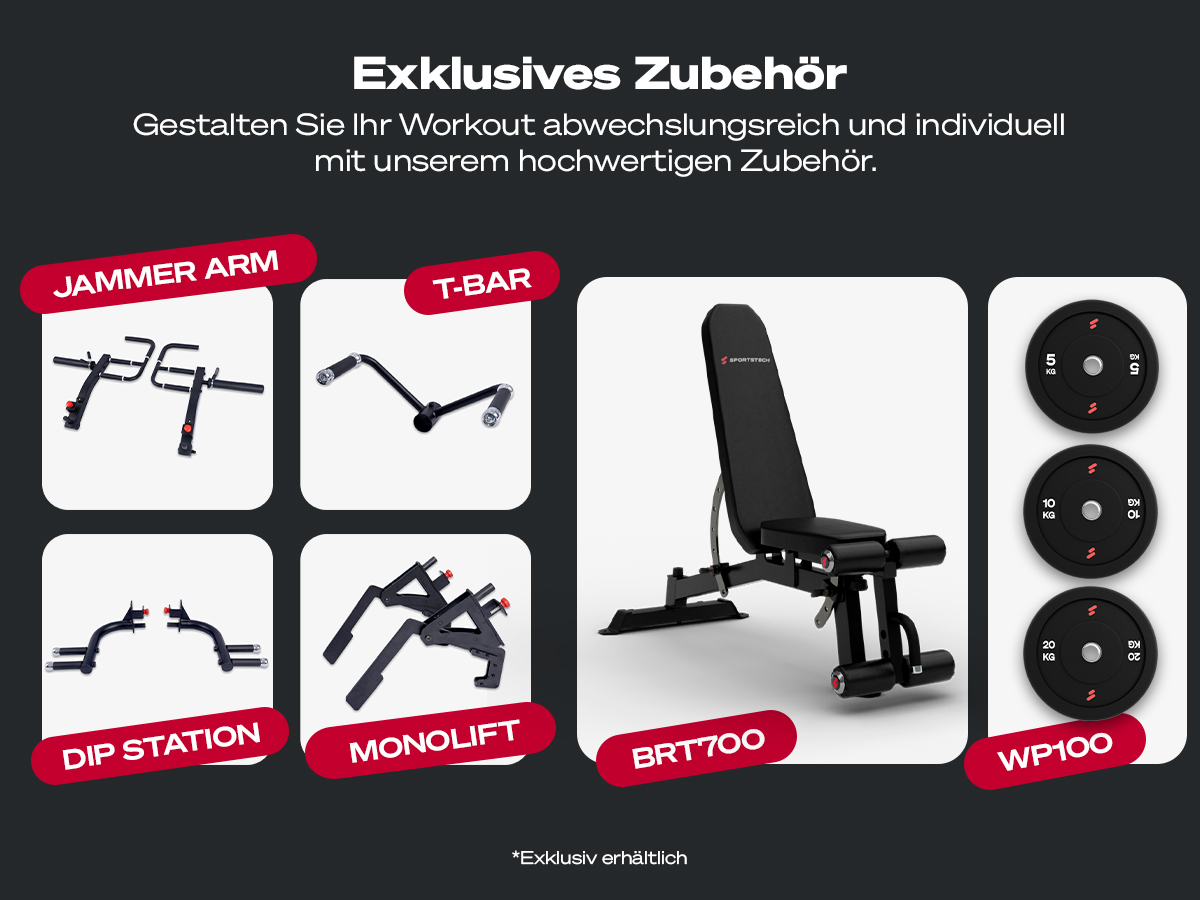 - vielseitiges Zubehör extra erhältlich wie T-Bar Griff , Monolift oder extra Langhantel