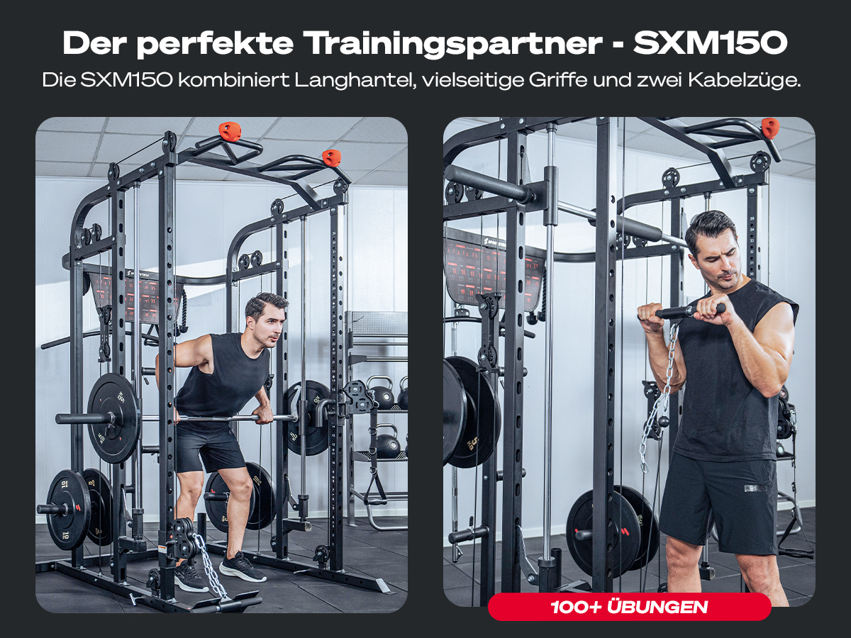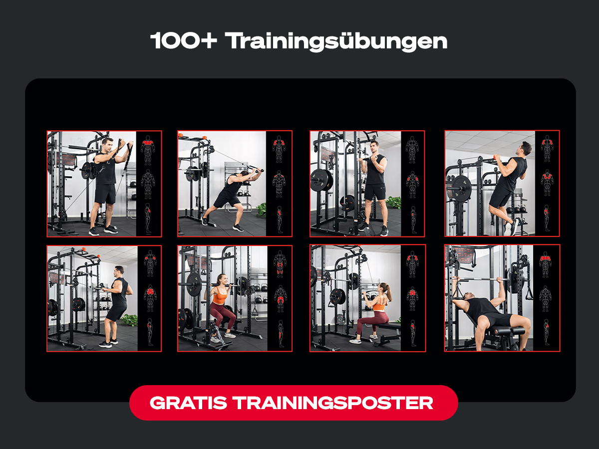 - 100+ Übungsvarianten: Bankdrücken, T-Bar Rudern, Lunges und vieles mehr.