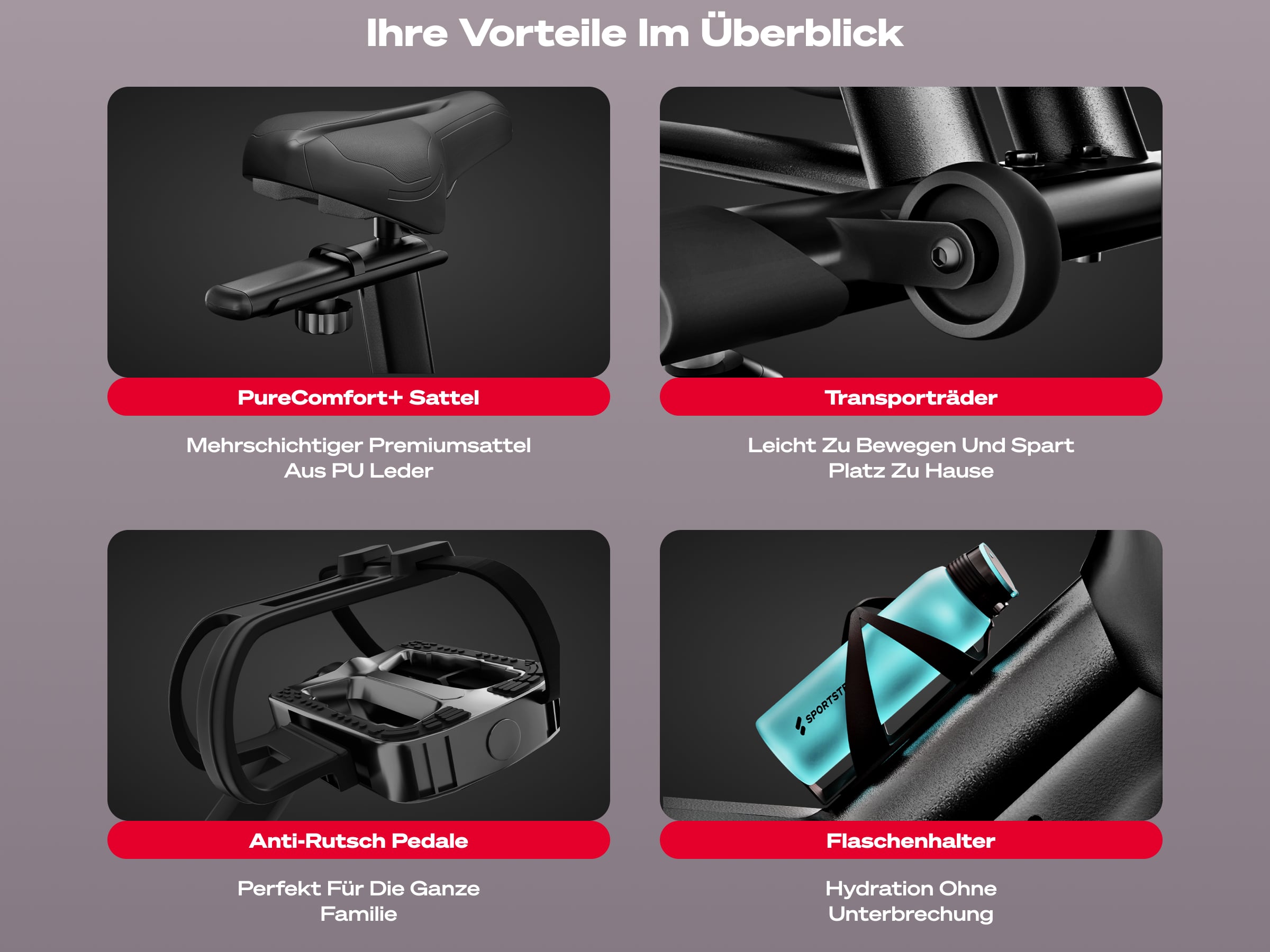 - Achtung Verletzungsgefahr: Das Schwungrad besitzt keine Freilauf-Funktion. Die Pedale drehen sich weiter, auch wenn du aufhörst zu treten.