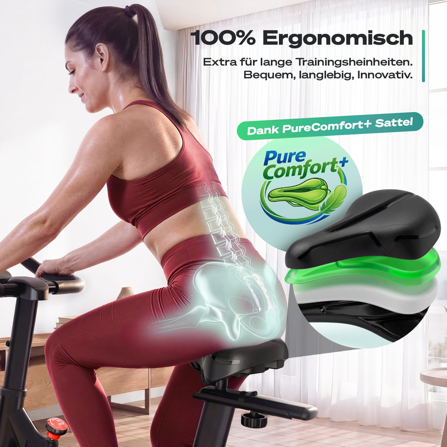 Das Indoor Bike ist für eine Körpergröße von 1,55 bis 1,90 m geeignet. Der mehrschichtige Komfortsattel ist höhenverstellbar von 65 bis 72 cm und unterstützt eine ergonomische Sitzposition.