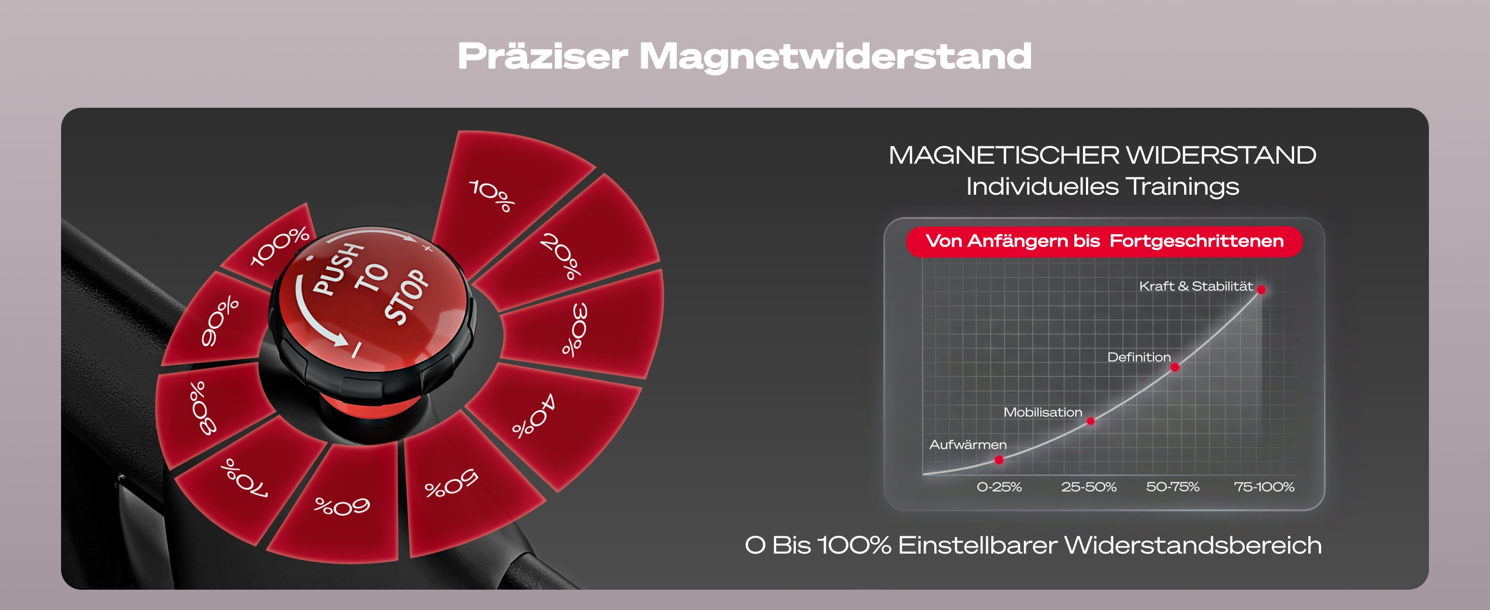 Ein Magnetbremssystem bietet den Vorteil eines leisen Betriebs und einer gleichmäßigen, präzisen Widerstandseinstellung. Es verursacht keinen Verschleiß an Bremsbelägen und ist wartungsarm, was zu einer längeren Haltbarkeit und besserem Komfort führt.