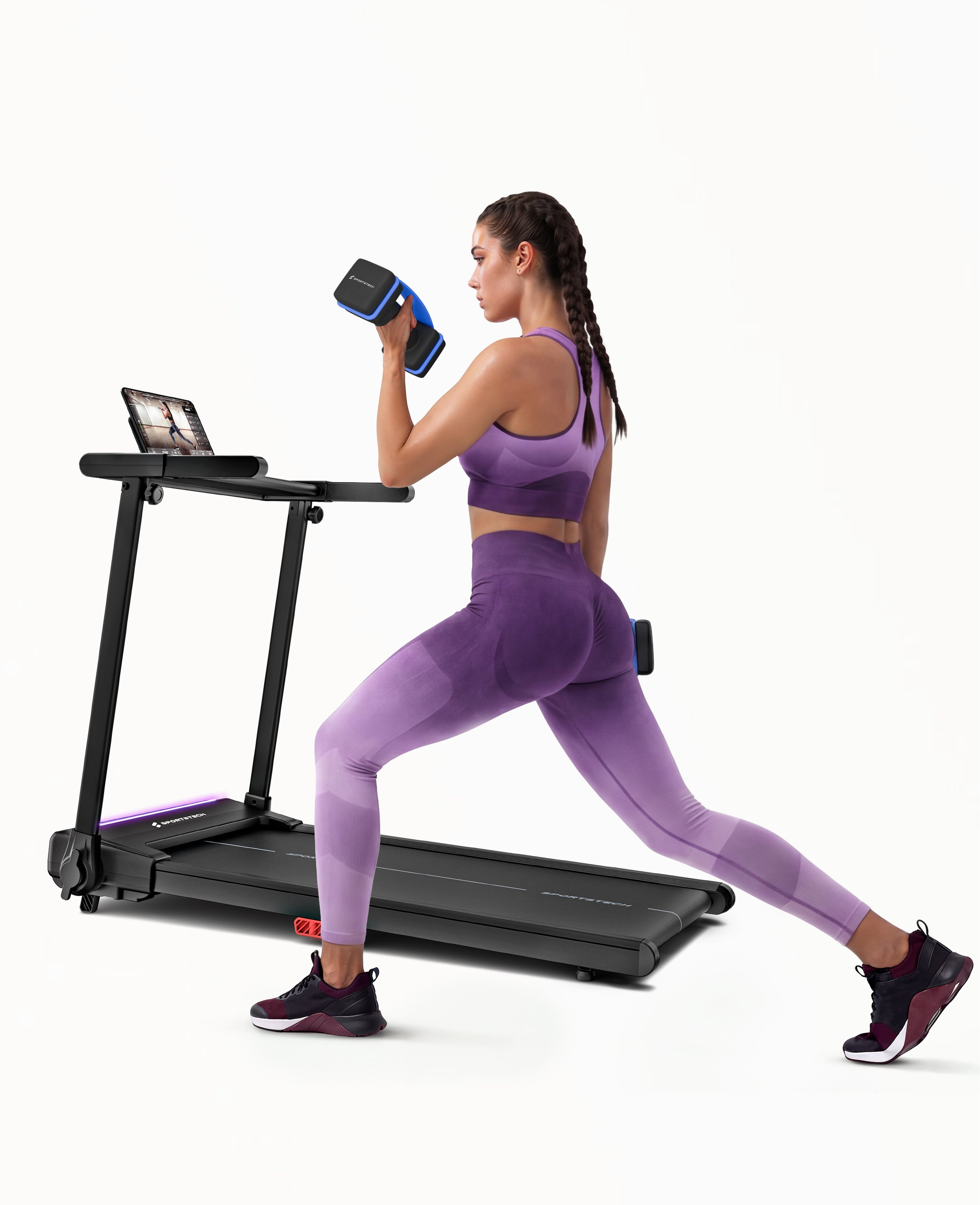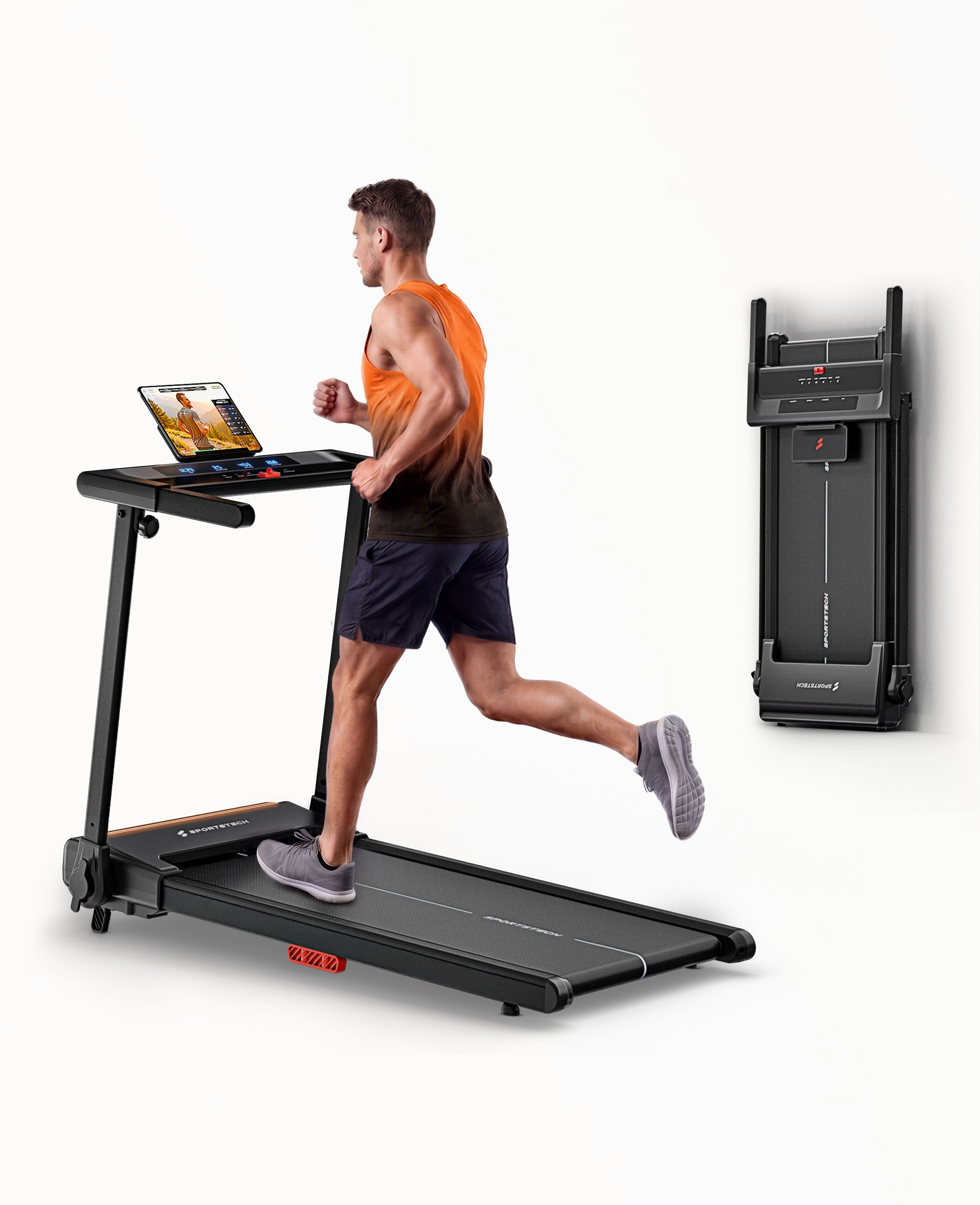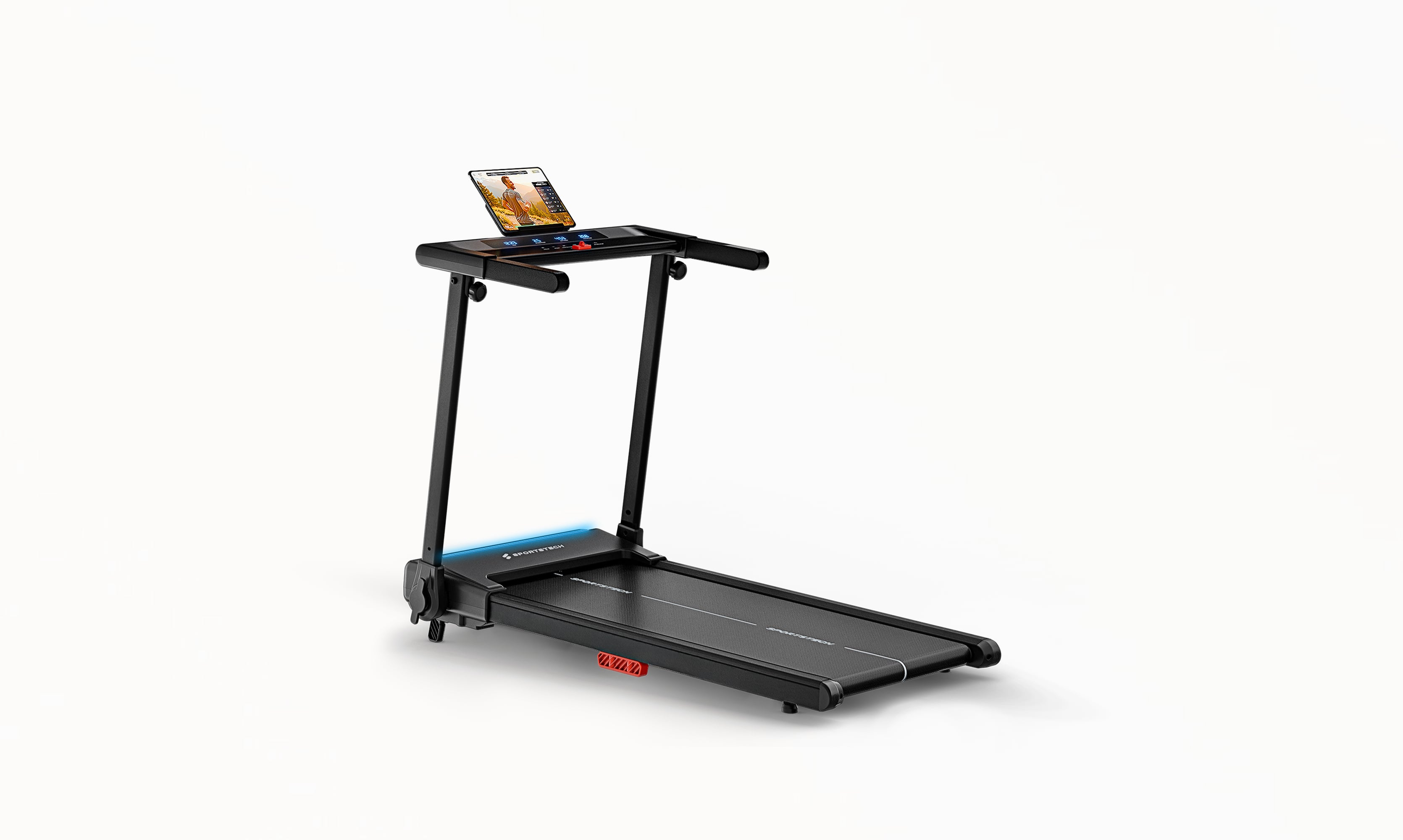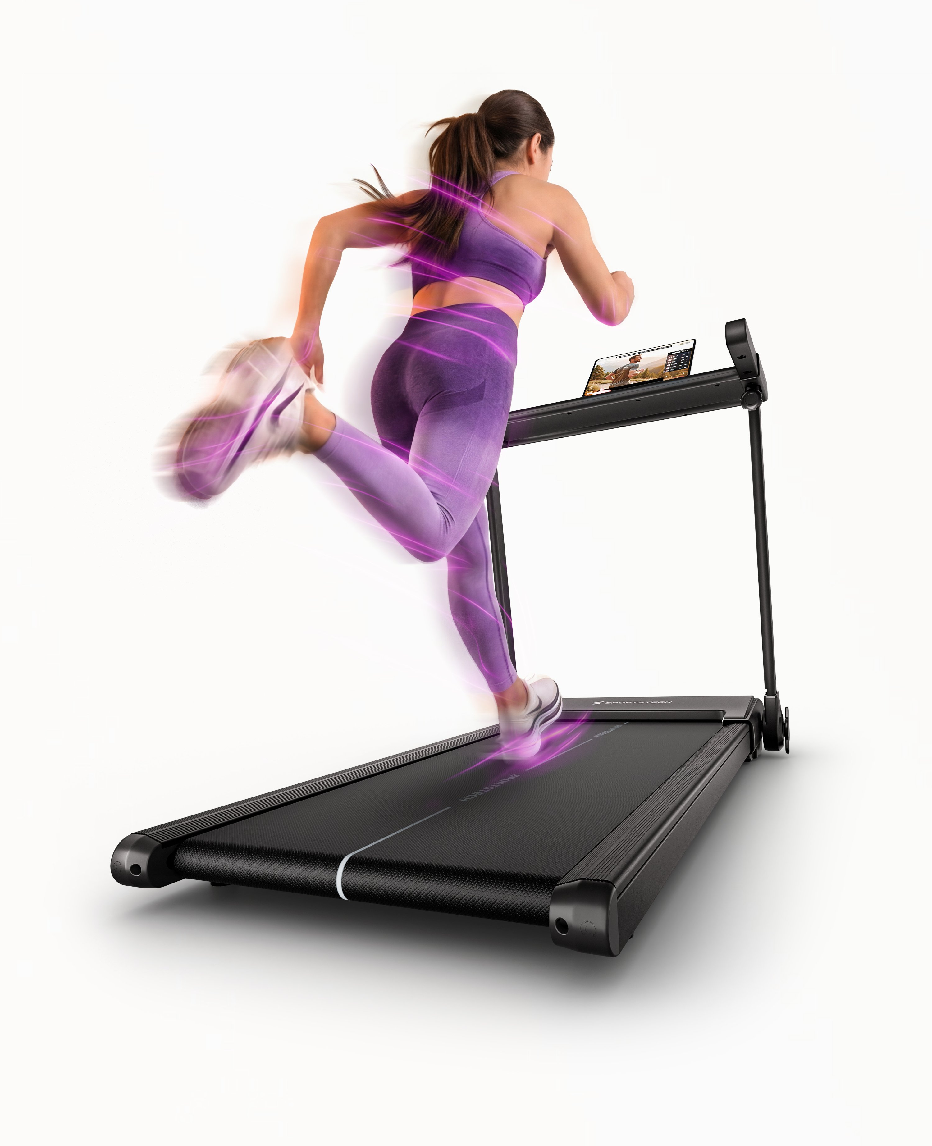 Das sProRun ist unser neustes Laufband für Zuhause. Es ist ideal für ein schnelles und effektives Lauftraining. Mit LED Farben, die sich nach Ihrer Laufgeschwindigkeit bis 12 km/h anpassen, einer Tablethalterung und LCD Display sind sie bestens vorbereitet. Die 9% Steigung sorgt für eine effektive Steigerung der Trainingsintensität, während das moderne Dämpfungssystem Ihre Gelenke schont. Mit praktischer Klappfunktion und smarter Steuerung ist das sProRun ideal für Ihr Homegym.